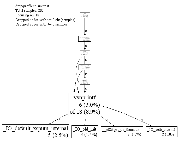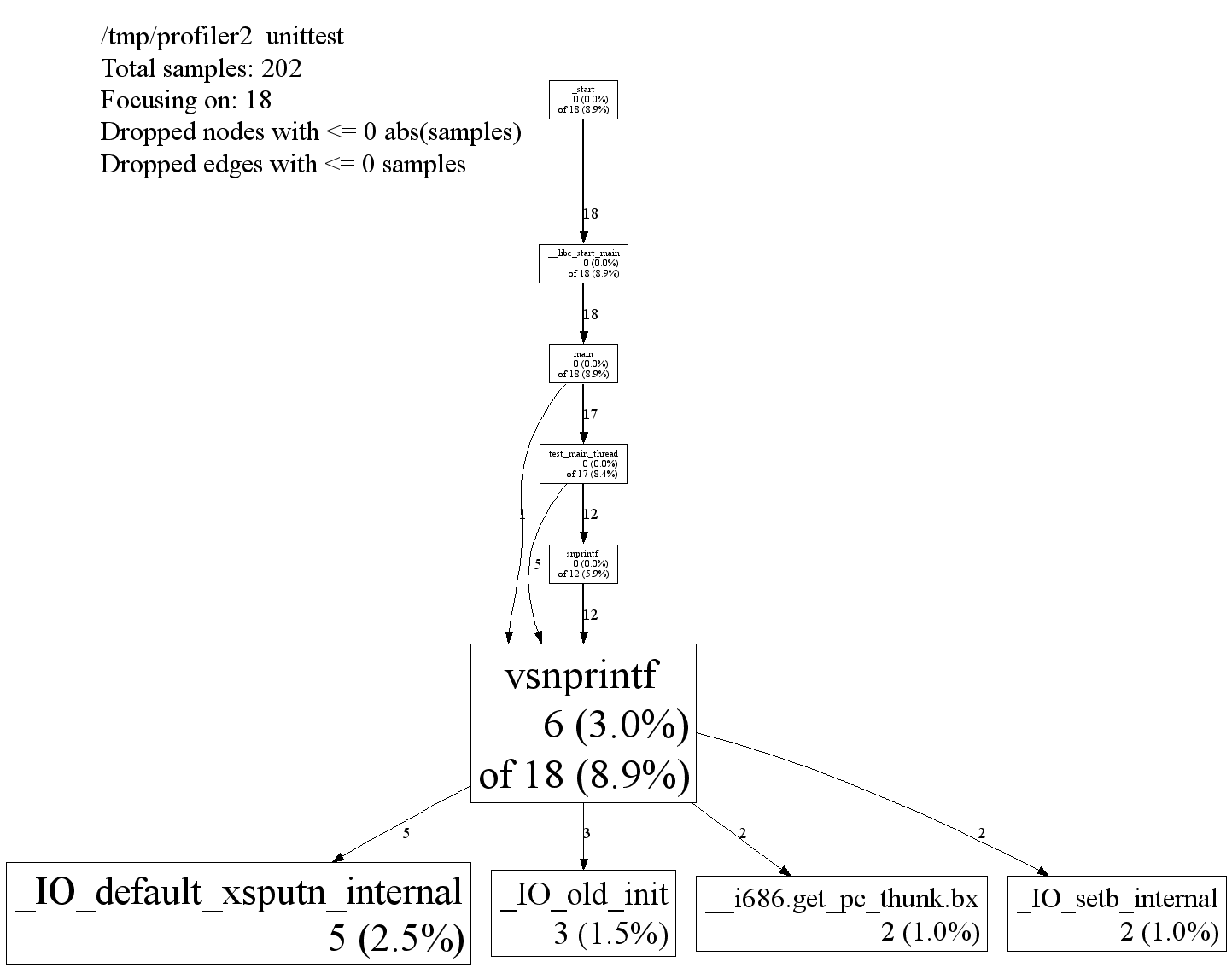 Note that test_main_thread() has an edge to vsnprintf(), even though test_main_thread() doesn't call that function directly. This is because the code was compiled with -O2; the profile reflects the optimized control flow.